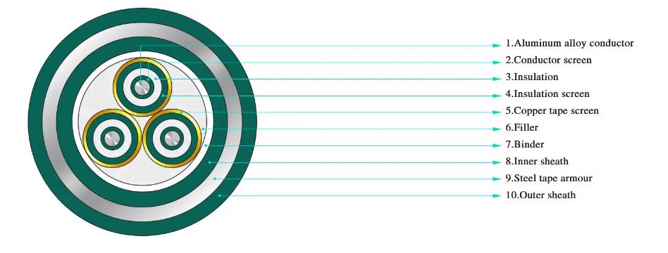 · Tre-leder XLPE isolering ståltråd armeret strømkabel til nominel spænding fra 3,6/6kV~26/35kV